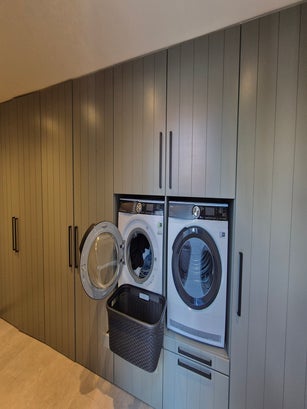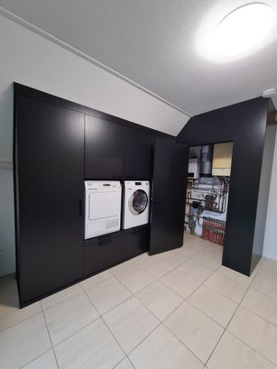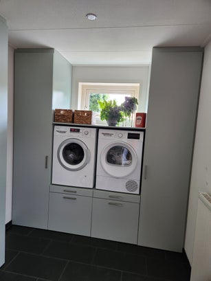 Bent u op zoek naar een bijkeuken die niet alleen praktisch is, maar er ook nog eens strak uitziet? Wij ontwerpen en realiseren bijkeukens waar alles netjes en georganiseerd is weggewerkt. Denk aan een kast waarin uw wasmachine, droger en zelfs de c.v.-ketel volledig uit het zicht blijven. De indeling wordt helemaal naar uw wens gemaakt, met aandacht voor ergonomie en gebruiksvriendelijkheid. Bovendien is elke kast leverbaar in elke gewenste RAL-kleur, zodat uw bijkeuken perfect aansluit bij de rest van uw interieur. Kies voor een functionele én stijlvolle oplossing!